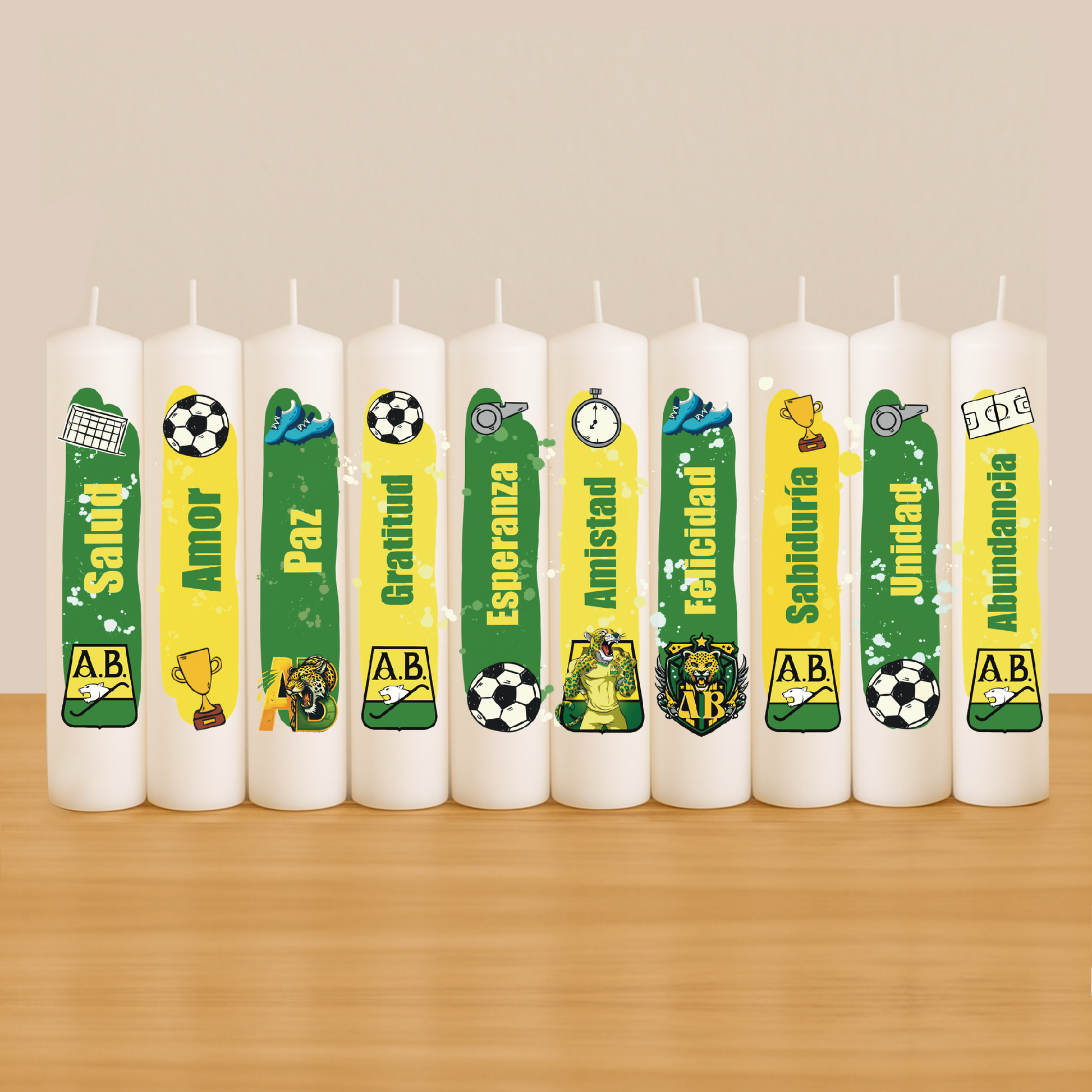 Caja con 10 velas blancas decoradas con stickers navideños (tinta UV + adhesivo transparente).